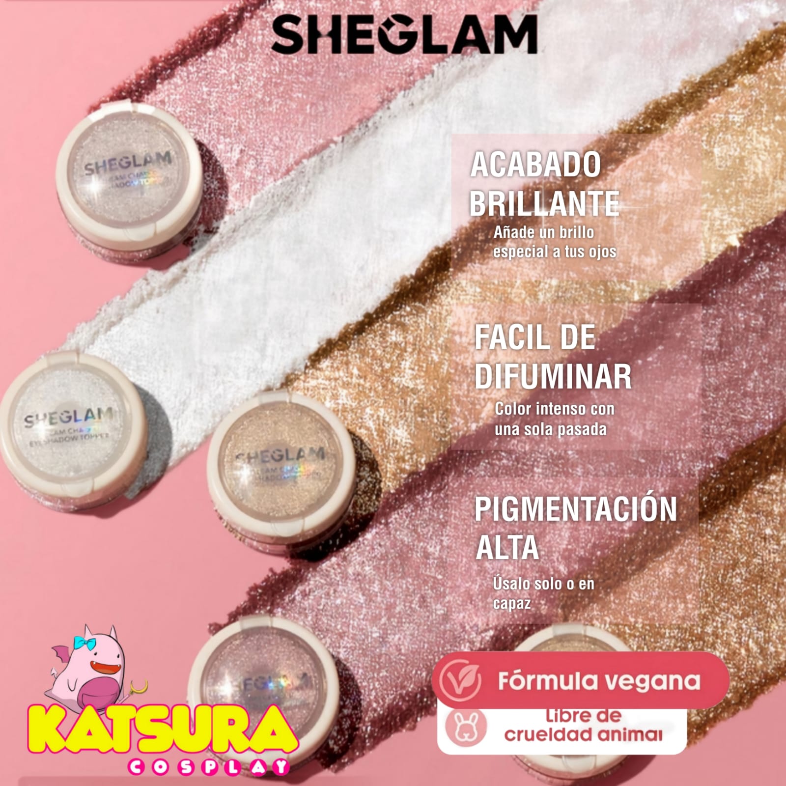 Las sombras de ojos de la imagen son los «Gleam Chaser Eyeshadow Toppers» de la marca SHEGLAM.